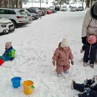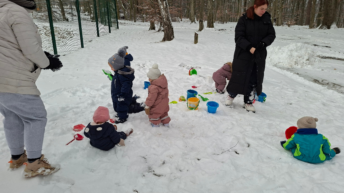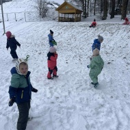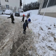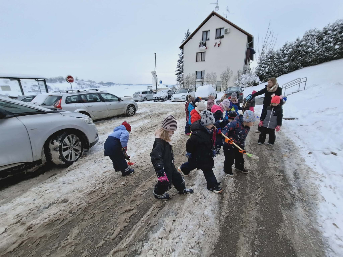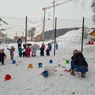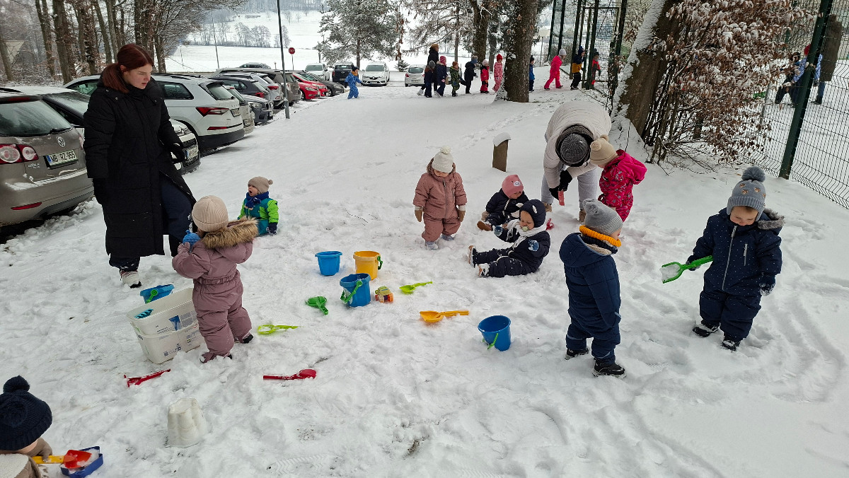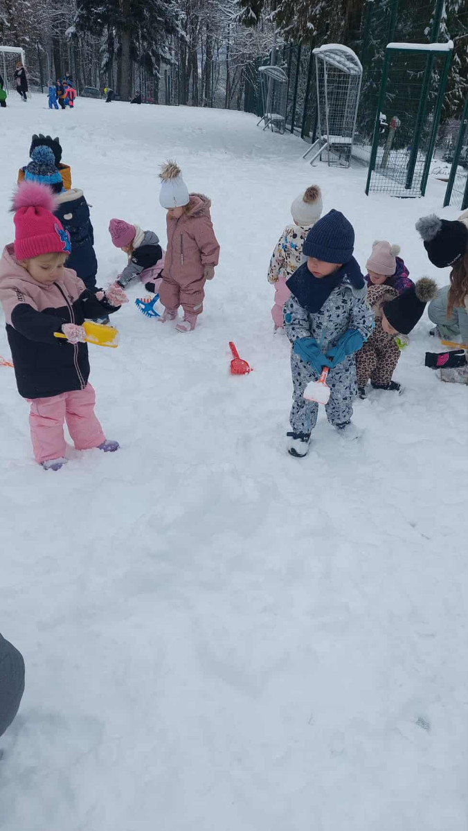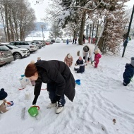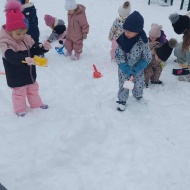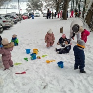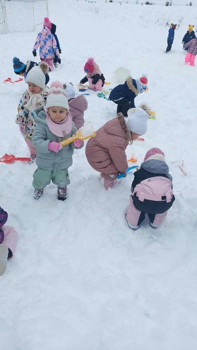 Že več dni zapored se snega radostimo in se z njim igramo na vse mogoče načine. Oblečeni v topla zimska oblačila, obuti v zimsko obutev in oboroženi z lopatkami, vedri in še marsičem, smo se vsak dan podali na zimske dogodivščine. Kepanje, kopanje, prenašanje snega, vožnja z lopatkami, čiščenje parkirišča in raziskovanje so postali del naše vsakdanje igre.
