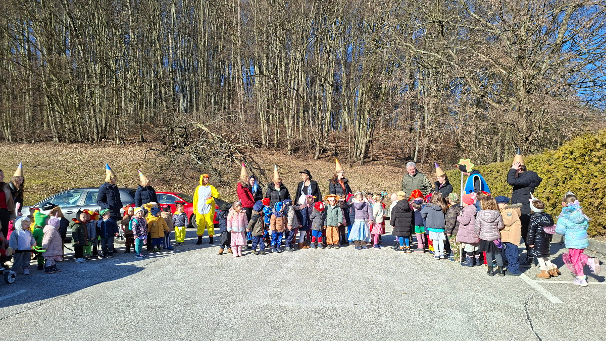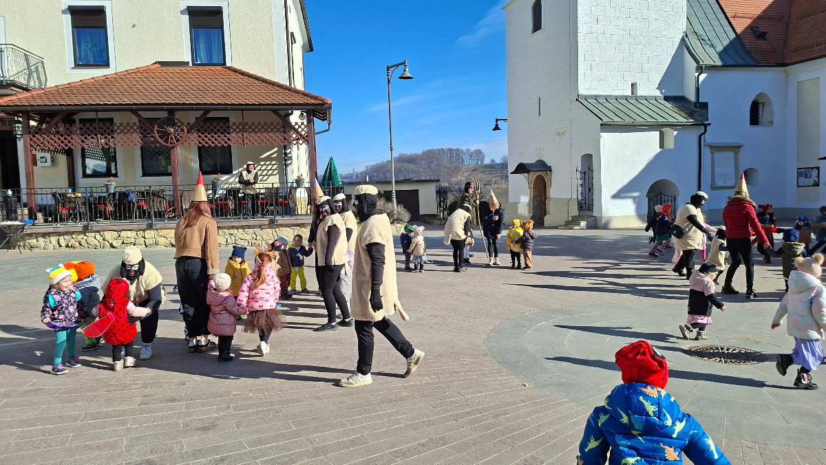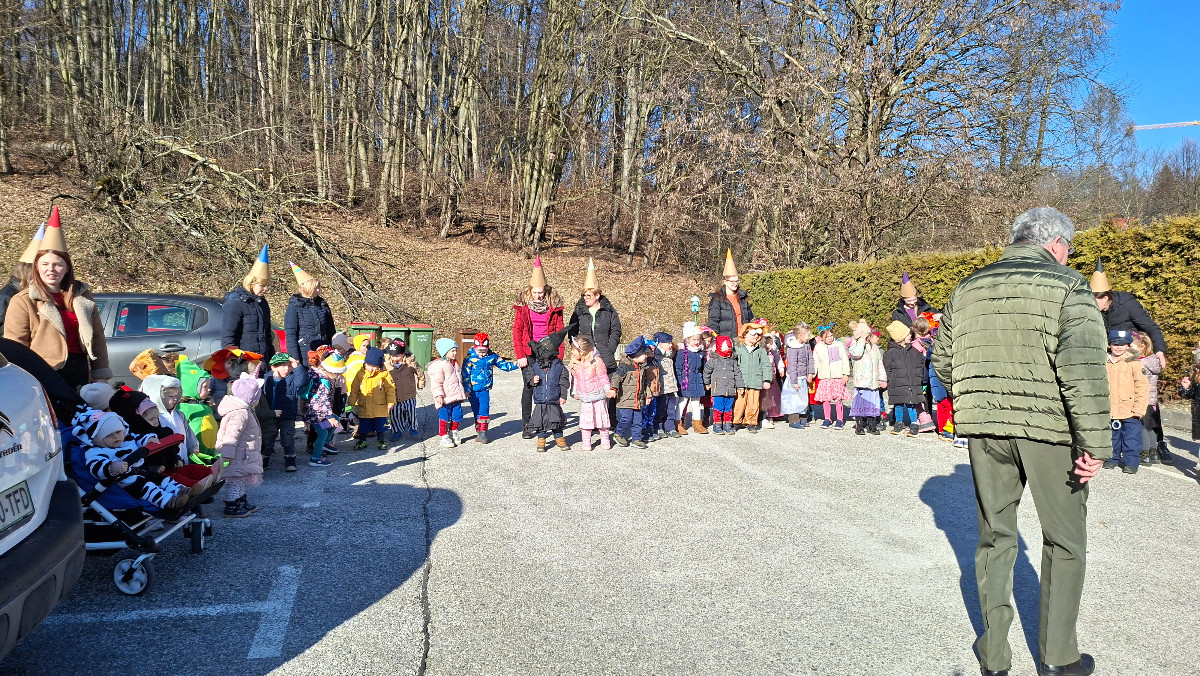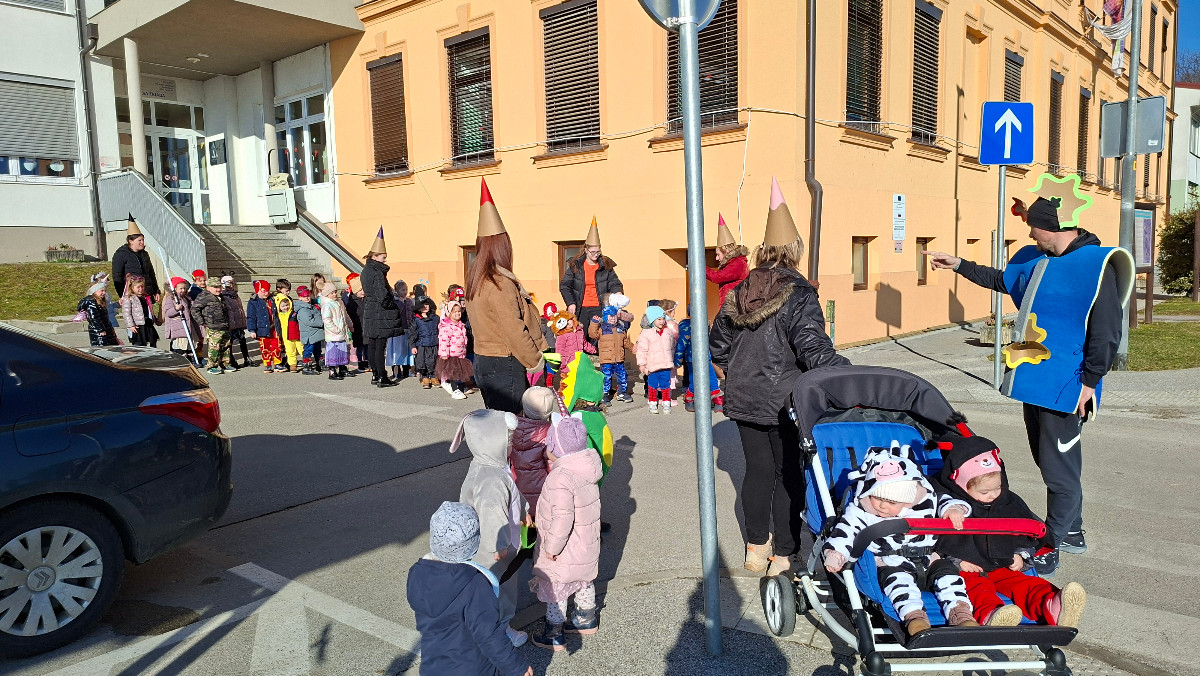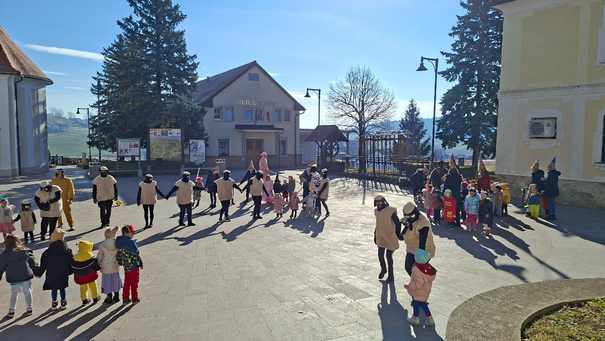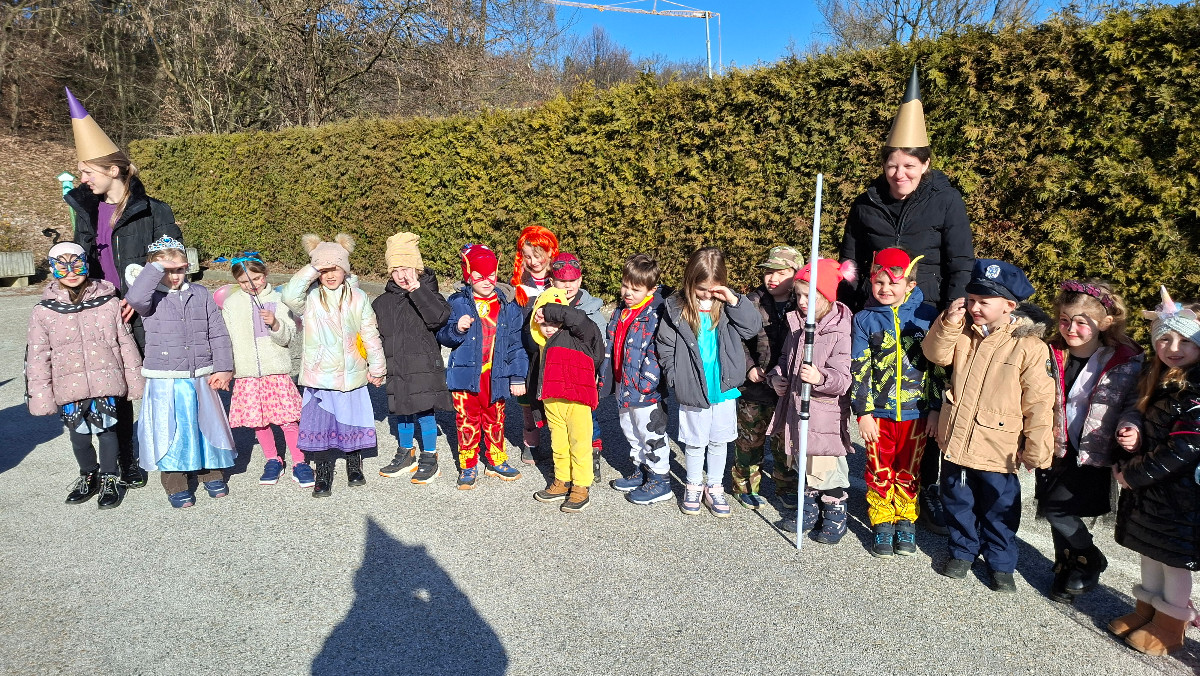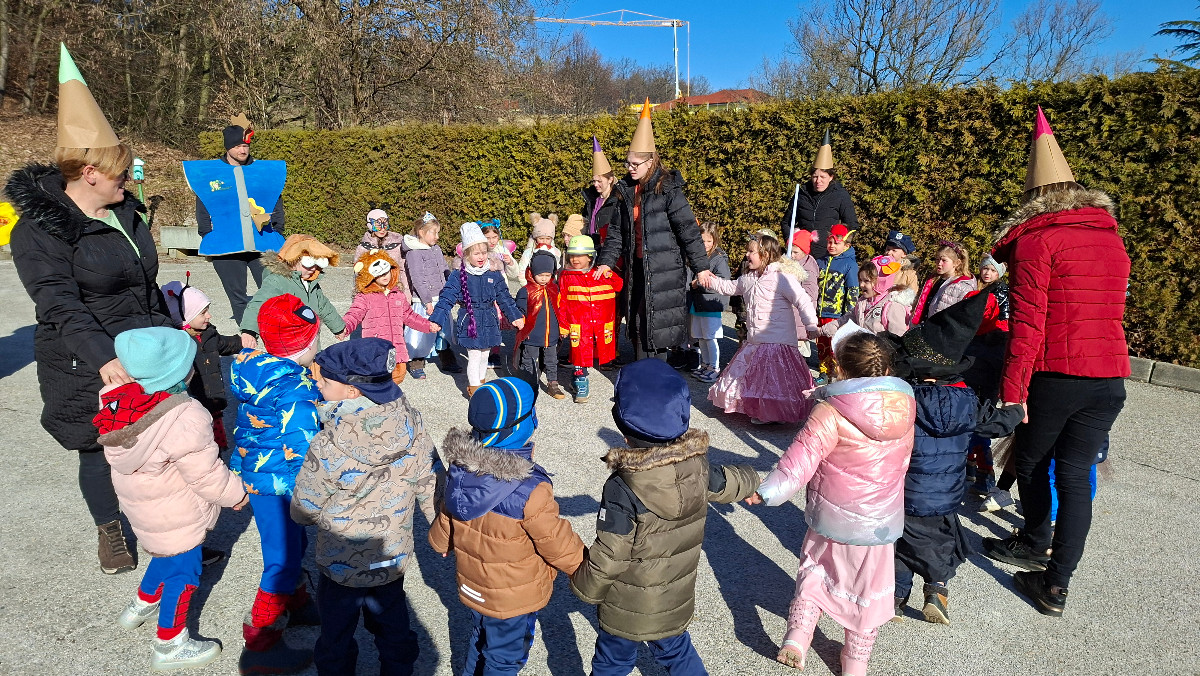 Na pustni dan v našem vrtcu nihče ni bil to, kar je sicer! Namesto otrok so nas obiskali gasilci, dinozavri, čarovnice, čebelice, metulji, super junaki, nogometaši in še cela vrsta skrivnostnih (in zelo glasnih) bitij. Priznamo – nekaj trenutkov smo potrebovali, da smo ugotovili, kdo se skriva pod vsemi temi klobuki, čeladami in luskami! Krila so frfotala, čarovniške metle so skoraj povzročile prometni zamašek, dinozavri pa so (na srečo) jedli le krofe in ne vzgojiteljic. O ja – krofi! Sladkani nasmehi, posuti s sladkorjem v prahu, so dokaz, da pust brez krofa preprosto ne obstaja. Tudi vzgojiteljice nismo ostale čisto resne – preobrazile smo se v skupinsko masko Jolly barvic in s pisanimi barvami še dodatno popestrile dan. Če že preganjamo zimo, jo preženimo v vseh barvah! Že prejšnji teden so nas obiskali kurenti, ki so z glasnim zvonjenjem in poskakovanjem uspešno odganjali zimo ter nam pričarali pravo tradicionalno pustno doživetje. Na pustni dan pa smo se podali še na veselo povorko proti občini. Tam so nas prijazno sprejeli občinski uslužbenci in nas pogostili z bomboni, ki so dali našim korakom še dodatno energijo. Ob koncu povorke smo veselo zarajali skupaj z družino Backov Jonov, skupino krajanov, ki nas vsako leto razveseli s svojim obiskom in dobro voljo. Tako smo se poslovili od Pusta, naj počiva do naslednjega leta. Mi pa se že veselimo pomladi, sonca in novih dogodivščin. Iskrena hvala vsem obiskovalcem, gostiteljem in vsem, ki ste z nami rajali, zvonili, sladkali in se smejali. Brez vas bi bil pust samo navaden torek – tako pa je bil čisto pravi pustni spektakel!