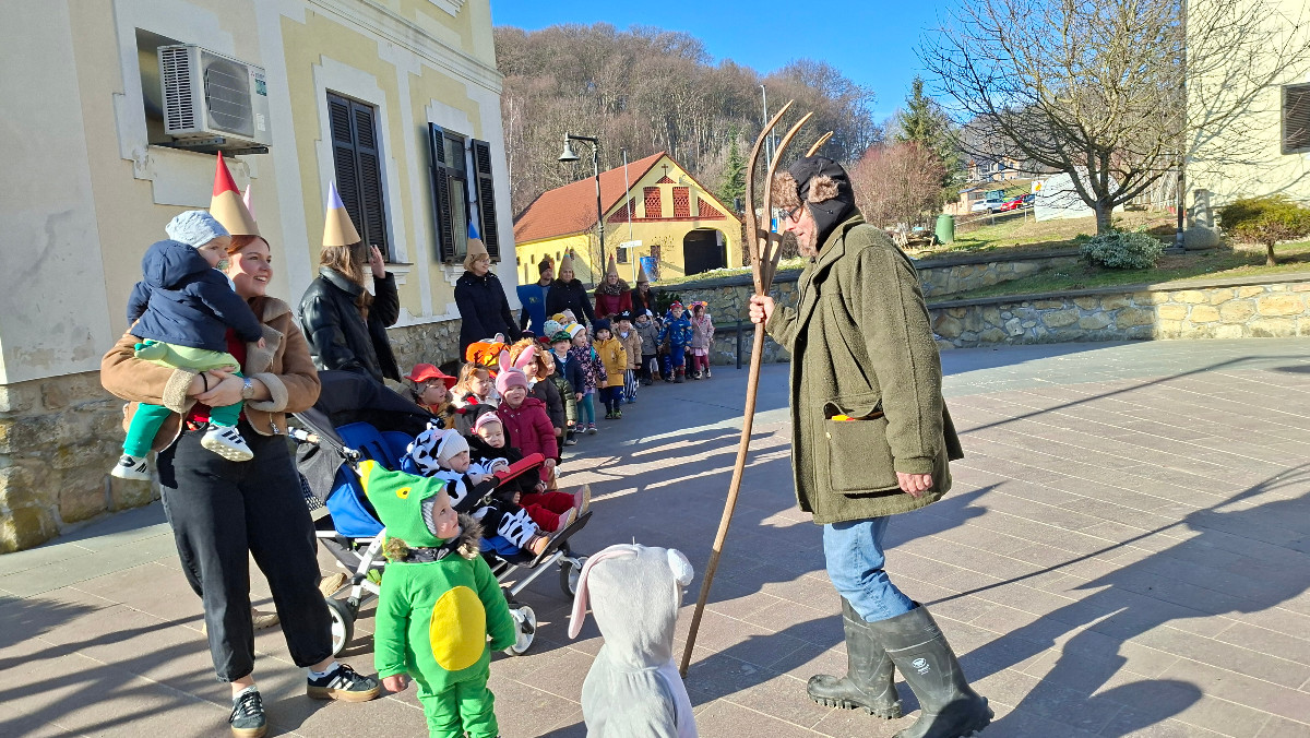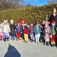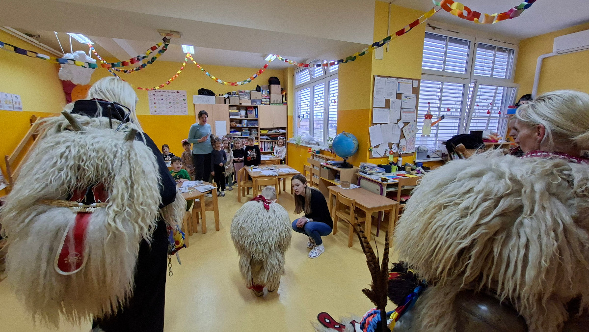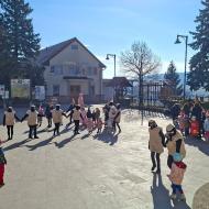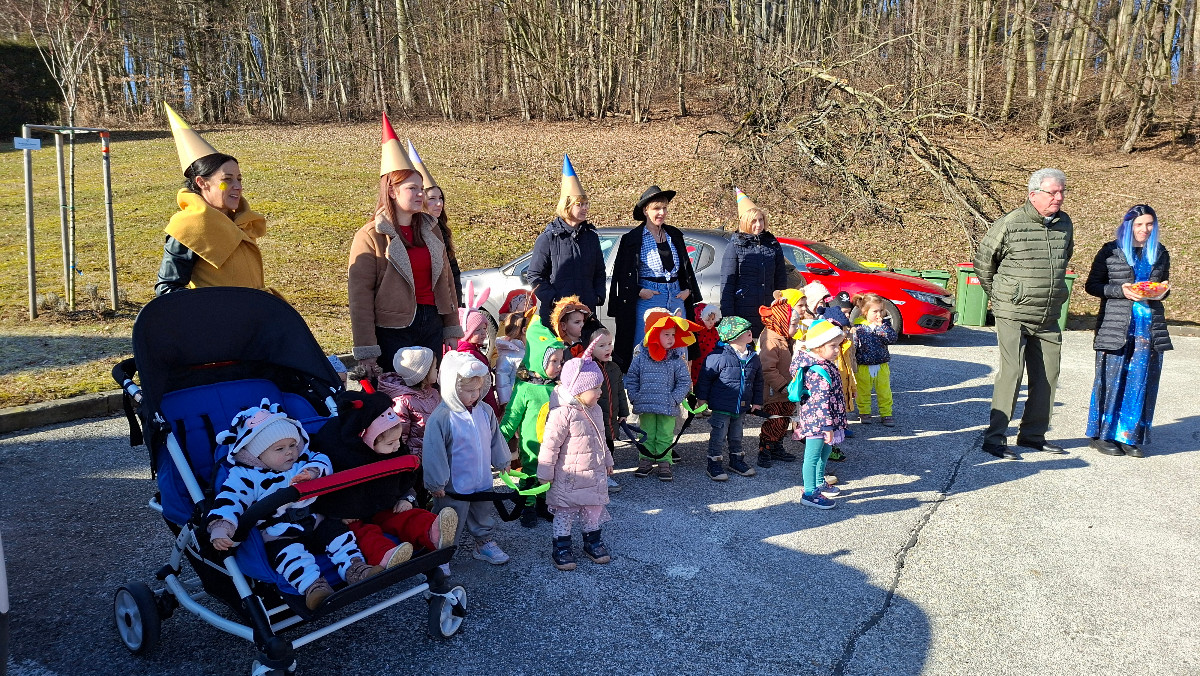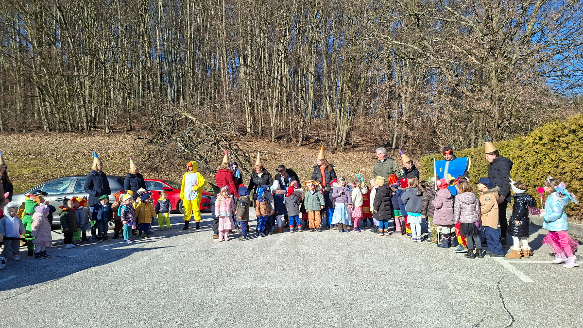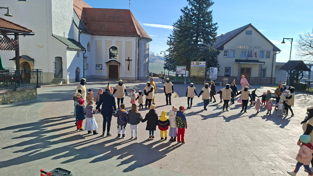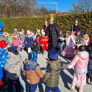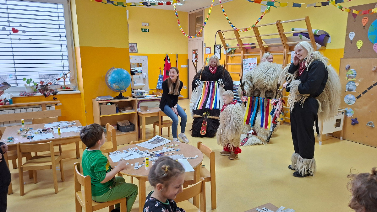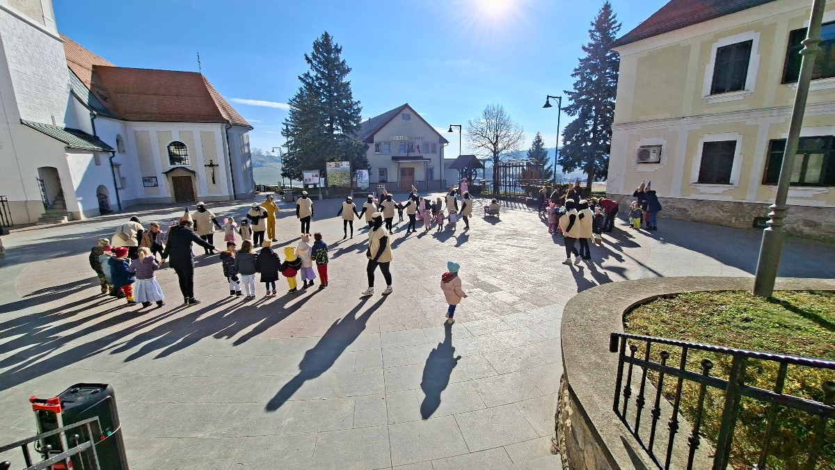 Na pustni dan v našem vrtcu nihče ni bil to, kar je sicer! Namesto otrok so nas obiskali gasilci, dinozavri, čarovnice, čebelice, metulji, super junaki, nogometaši in še cela vrsta skrivnostnih (in zelo glasnih) bitij. Priznamo – nekaj trenutkov smo potrebovali, da smo ugotovili, kdo se skriva pod vsemi temi klobuki, čeladami in luskami! Krila so frfotala, čarovniške metle so skoraj povzročile prometni zamašek, dinozavri pa so (na srečo) jedli le krofe in ne vzgojiteljic. O ja – krofi! Sladkani nasmehi, posuti s sladkorjem v prahu, so dokaz, da pust brez krofa preprosto ne obstaja. Tudi vzgojiteljice nismo ostale čisto resne – preobrazile smo se v skupinsko masko Jolly barvic in s pisanimi barvami še dodatno popestrile dan. Če že preganjamo zimo, jo preženimo v vseh barvah! Že prejšnji teden so nas obiskali kurenti, ki so z glasnim zvonjenjem in poskakovanjem uspešno odganjali zimo ter nam pričarali pravo tradicionalno pustno doživetje. Na pustni dan pa smo se podali še na veselo povorko proti občini. Tam so nas prijazno sprejeli občinski uslužbenci in nas pogostili z bomboni, ki so dali našim korakom še dodatno energijo. Ob koncu povorke smo veselo zarajali skupaj z družino Backov Jonov, skupino krajanov, ki nas vsako leto razveseli s svojim obiskom in dobro voljo. Tako smo se poslovili od Pusta, naj počiva do naslednjega leta. Mi pa se že veselimo pomladi, sonca in novih dogodivščin. Iskrena hvala vsem obiskovalcem, gostiteljem in vsem, ki ste z nami rajali, zvonili, sladkali in se smejali. Brez vas bi bil pust samo navaden torek – tako pa je bil čisto pravi pustni spektakel!