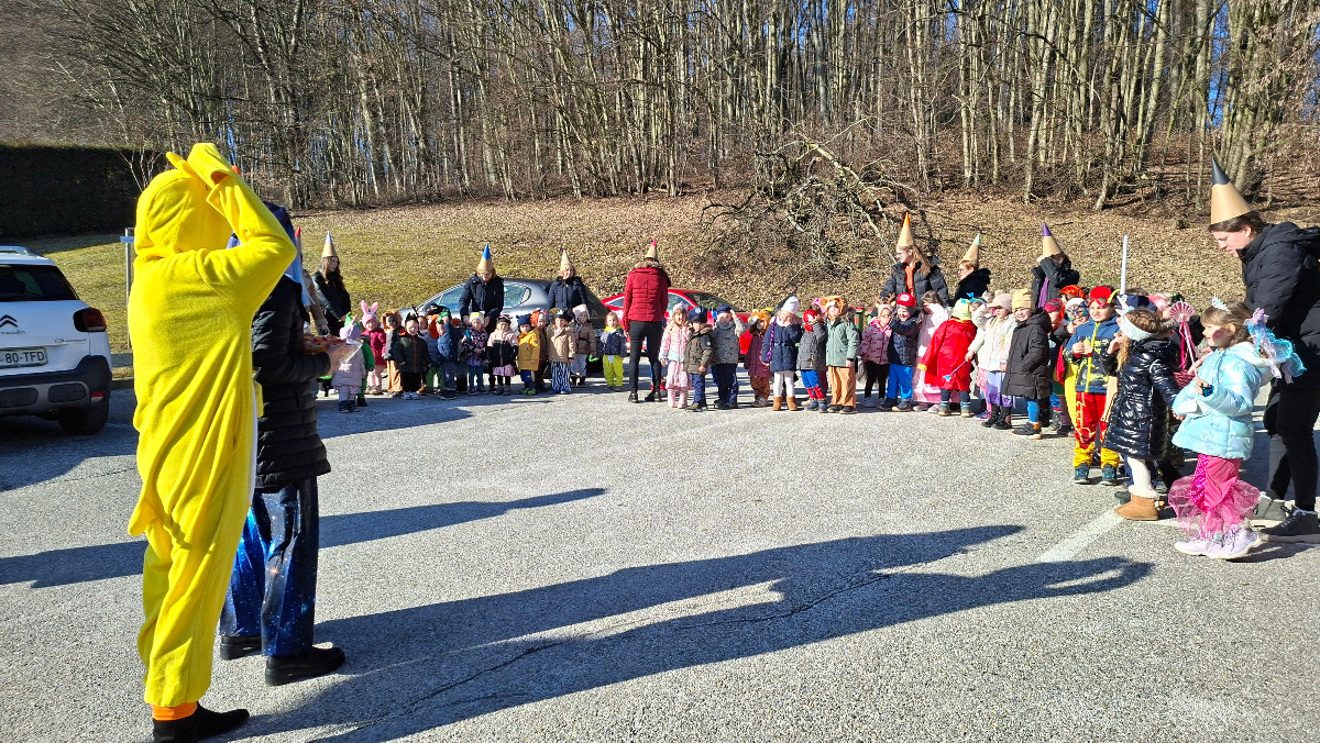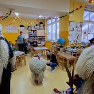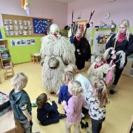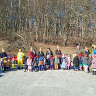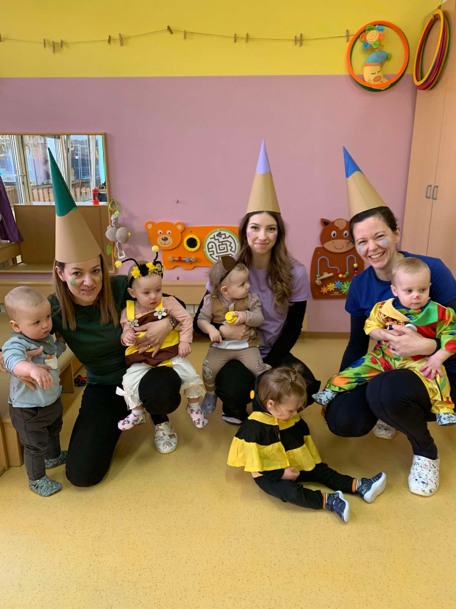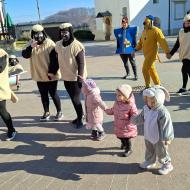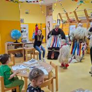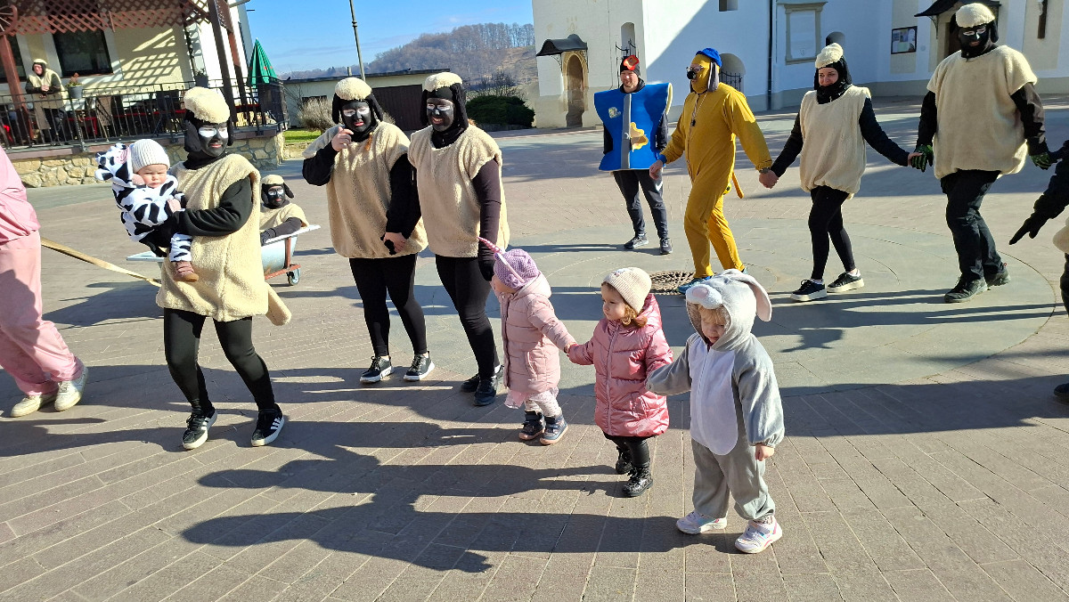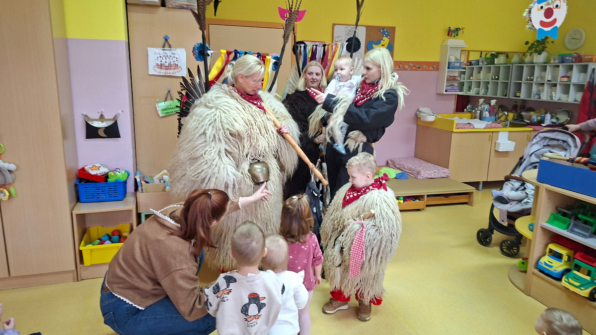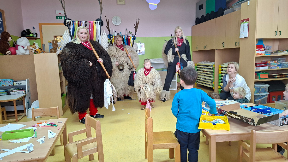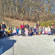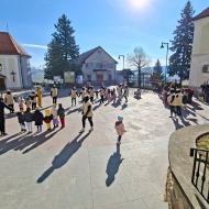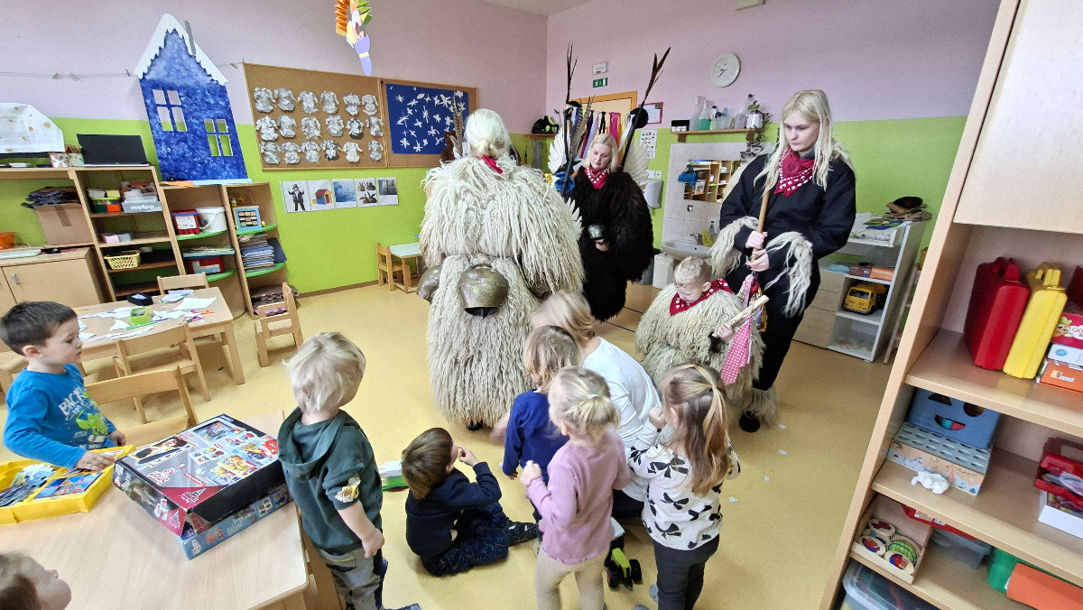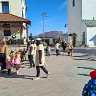 Na pustni dan v našem vrtcu nihče ni bil to, kar je sicer! Namesto otrok so nas obiskali gasilci, dinozavri, čarovnice, čebelice, metulji, super junaki, nogometaši in še cela vrsta skrivnostnih (in zelo glasnih) bitij. Priznamo – nekaj trenutkov smo potrebovali, da smo ugotovili, kdo se skriva pod vsemi temi klobuki, čeladami in luskami! Krila so frfotala, čarovniške metle so skoraj povzročile prometni zamašek, dinozavri pa so (na srečo) jedli le krofe in ne vzgojiteljic. O ja – krofi! Sladkani nasmehi, posuti s sladkorjem v prahu, so dokaz, da pust brez krofa preprosto ne obstaja. Tudi vzgojiteljice nismo ostale čisto resne – preobrazile smo se v skupinsko masko Jolly barvic in s pisanimi barvami še dodatno popestrile dan. Če že preganjamo zimo, jo preženimo v vseh barvah! Že prejšnji teden so nas obiskali kurenti, ki so z glasnim zvonjenjem in poskakovanjem uspešno odganjali zimo ter nam pričarali pravo tradicionalno pustno doživetje. Na pustni dan pa smo se podali še na veselo povorko proti občini. Tam so nas prijazno sprejeli občinski uslužbenci in nas pogostili z bomboni, ki so dali našim korakom še dodatno energijo. Ob koncu povorke smo veselo zarajali skupaj z družino Backov Jonov, skupino krajanov, ki nas vsako leto razveseli s svojim obiskom in dobro voljo. Tako smo se poslovili od Pusta, naj počiva do naslednjega leta. Mi pa se že veselimo pomladi, sonca in novih dogodivščin. Iskrena hvala vsem obiskovalcem, gostiteljem in vsem, ki ste z nami rajali, zvonili, sladkali in se smejali. Brez vas bi bil pust samo navaden torek – tako pa je bil čisto pravi pustni spektakel!