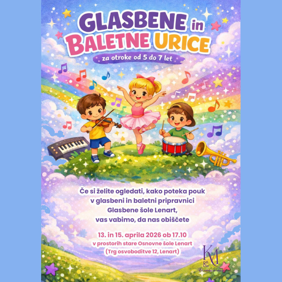 Konservatorij za glasbo in balet, podružnica Lenart, vas vljudno vabi na glasbene in baletne urice, v okviru katerih si boste lahko ogledali, kako poteka pouk v glasbeni in baletni pripravnici. Urice so namenjene otrokom od 5 do 7 let in bodo potekale 13. 4. in 15. 4. ob 17.10 uri v prostorih stare Osnovne šole Lenart.