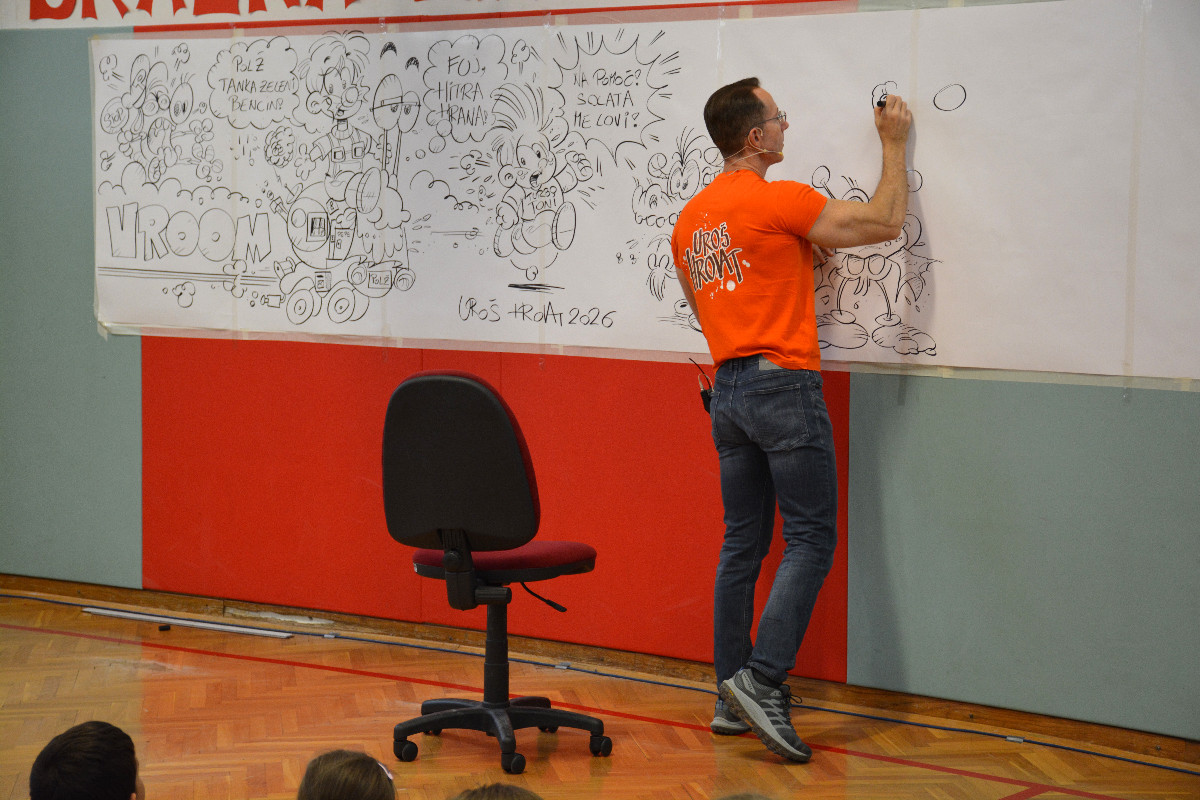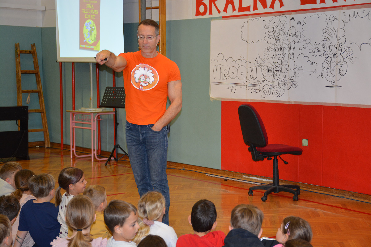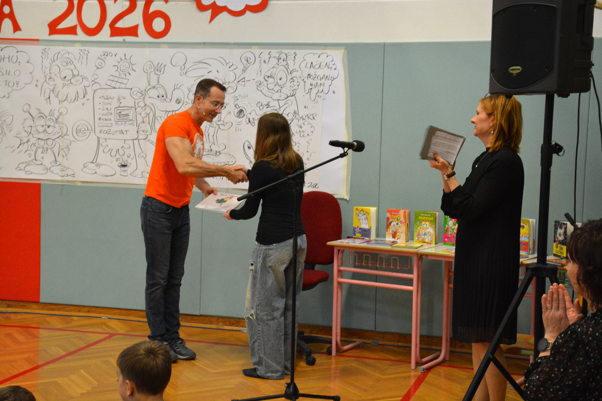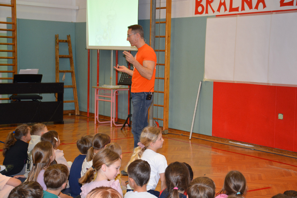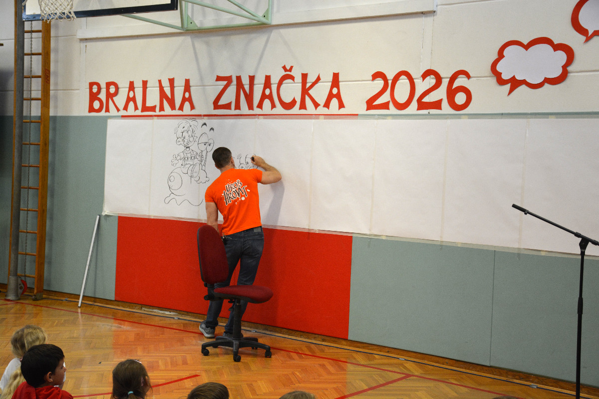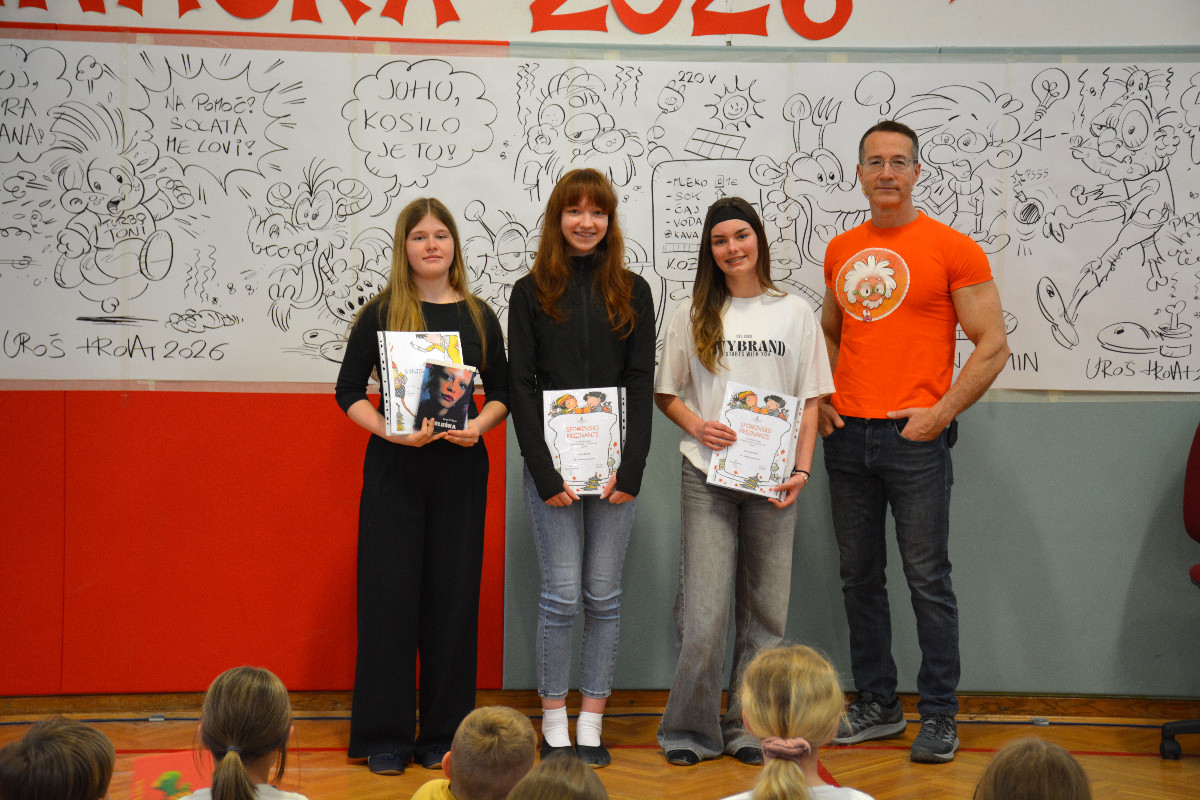 Dan smo sklenili s slavnostno prireditvijo. Uživali smo ob odlični pevsko-glasbeni točki vokalne skupine in šolskega ansambla pod mentorstvom učiteljice Metke Caf, navdušili pa so nas tudi nežni zvoki flavte, ki jih je pričarala Ina Črnčec. Osrednji gost prireditve, ilustrator in pisatelj Uroš Hrovat, nas je nasmejal in očaral z ustvarjanjem svojih izjemnih ilustracij.