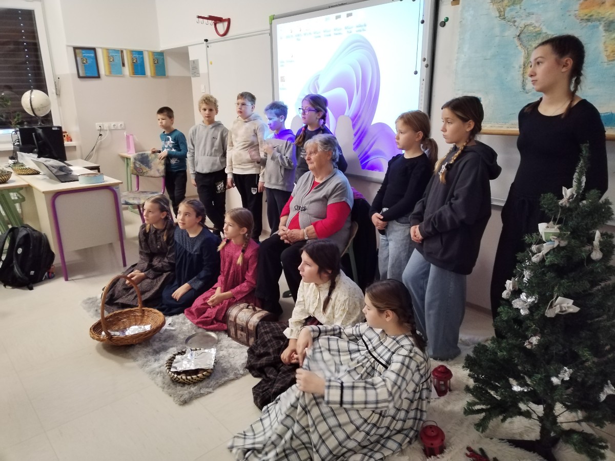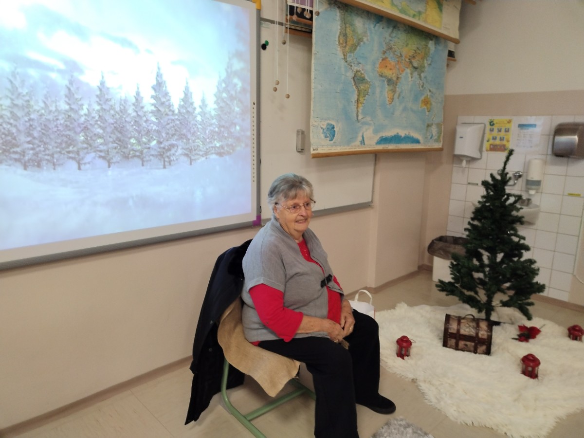 V okviru Babičine skrinjice nas je obiskala gospa Marica Fanedl iz Zgornjega Partinja – živa pričevalka nekdanjih časov, igralka in kulturna ustvarjalka, ki s svojo toplino ter pripovedovalskim darom zna očarati prav vsakega poslušalca. Učencem je na izredno pristen in ganljiv način predstavila zgodbe iz svojega otroštva in mladosti – zgodbe o skromnosti, preživetju in medsebojni povezanosti v času božiča in novega leta. Njeni spomini so nas popeljali v obdobje, ko so praznike oblikovali drobni trenutki: preprosto okraševanje božičnega drevesca, vonj domačega peciva, tišina družinskega miru ter pričakovanje polnočnice. V vsakem njenem stavku je bilo čutiti hvaležnost za skromne darove življenja in toplino, ki jo prinese skupnost. Ob koncu pripovedovanja so učenci podelili svoje misli o tem, kaj njim pomeni božični čas. Njihove besede so prepletle radovednost, veselje, pričakovanje in željo po bližini – vrednote, ki ostajajo večne, ne glede na čas, v katerem živimo. Našo skupno zgodbo smo zaključili s pesmijo "Dan ljubezni", ki je še posebej lepo poudarila sporočilo srečanja: da so najdragocenejši trenutki tisti, ki jih preživimo skupaj, obdani z ljubeznijo, spoštovanjem in medsebojnim razumevanjem.