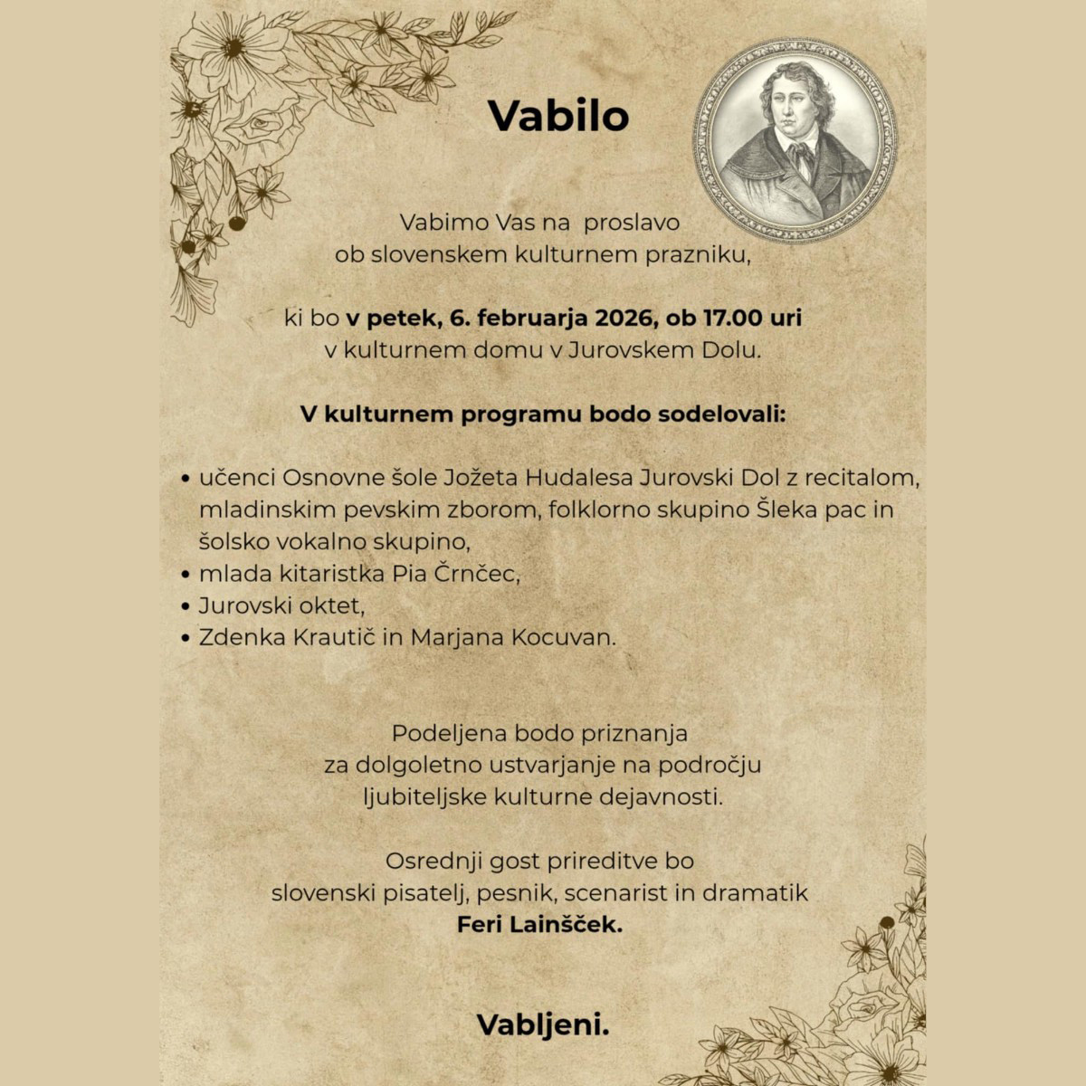 Kulturno društvo Ivan Cankar Jurovski Dol vas vljudno vabi na prireditev ob slovenskem kulturnem prazniku, ki bo v petek, 6. 2. 2026, ob 17.00 v kulturnem domu v Jurovskem Dolu. Naši učenci z mentorji so soustvarjalci kulturnega programa, katerega osrednji gost je Feri Lainšček.